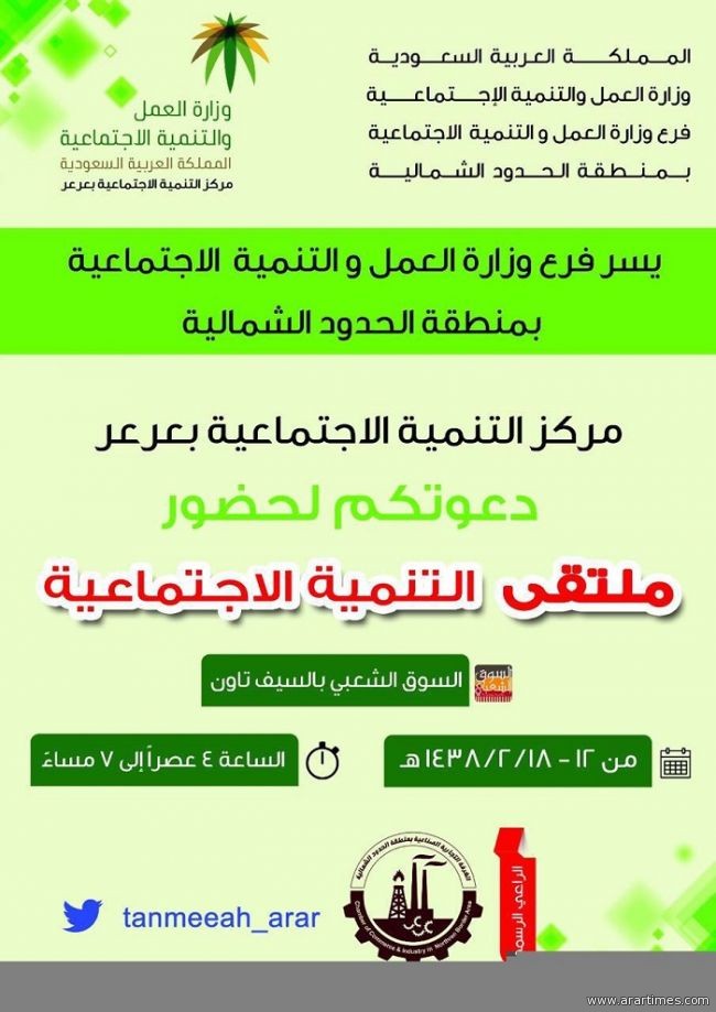 يسر فرع وزاره العمل والتنميه الاجتماعيه بمنطقه الحدود الشماليه دعوتكم لحضور (ملتقى التنمية الاجتماعية)والذي ينظمه مركز التنميه الاجتماعيه بعرعر ويشتمل الملتقئ مسابقات ترفيهيه واناشيد ومسرح للاطفال اعتبارا من ١٢-٢-١٤٣٨هـ الئ يوم الجمعه ١٨-٢-١٤٣٨هـ بالسوق الشعبي بالسيف تاون دعما للاسر المنتجه