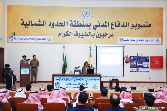 " مسؤولي السلامة في الاجهزة الحكومية" حيث افتتح سعادة مدير الدفاع المدني بمنطقة الحدود الشمالية العميد/ مانع بن شايع القحطاني فعاليات الندوة بكلمة اشار من خلالها بان هذه الندوة قد حظيت برعاية صاحب السمو الامير الدكتور مشعل بن عبدالله بن عبدالعزيز بن مساعد ال سعود امير منطقة الحدود الشمالية وثمن فيها حرص سموه الكريم على كافة جوانب السلامة والتوعية الوقائية وكذلك متابعة معالي مدير عام الدفاع المدني الفريق / سليمان العمرو لهذه الندوة وكونها تمثل تعزيزا للدور الهام لمسؤولي السلامة في الاجهزة الحكومية ثم بعد ذلك قدمت اوراق العمل وكانت على النحو التالي