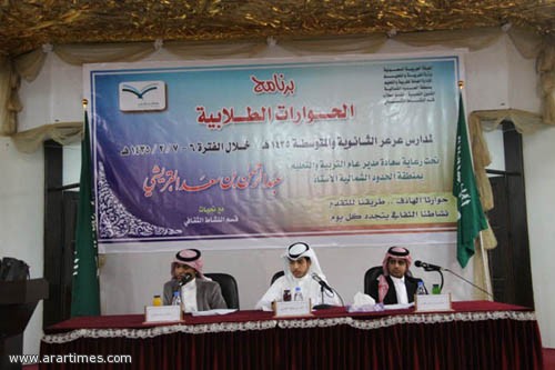 وبحضور عدد كبير من زملاءهم في المرحلتين المتوسطة والثانوية برنامج الحوارات الطلابية الذي ينفذه قسم النشاط الثقافي بالإدارة وافتتح المدير العام البرنامج الذي بدأه طلاب ثانوية الشيخ ابن باز بالحديث عن دور المدرسة في تنشئة الطالب وشاركهم المدير العام وعدد من الطلاب المناقشة والحوار ثم قدم طلاب مدارس الملك سعود الثانوية وابي بكر الصديق وواحة المعرفة ورياض الفكر الاهلية ومكة المكرمة مواضيع عن دور المعلم وولي الامر والمجتمع المحيط بالمدرسة في تنشئة الطالب