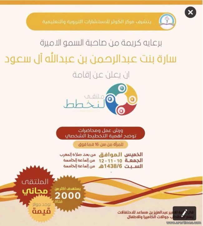 ينظم مركز الكوثر للأستشارات التربوية والتعليمية النسائي بمدينة عرعرملتقى بعنوان "لنخطط"،يوم الخميس القادم 1438/6/10برعاية كريمة من صاحبة السمو الأميرة: سارة بنت عبد الرحمن بن عبدالله آل سعود في قاعة الأمير عبدالعزيز بن مساعد للأحتفالات .