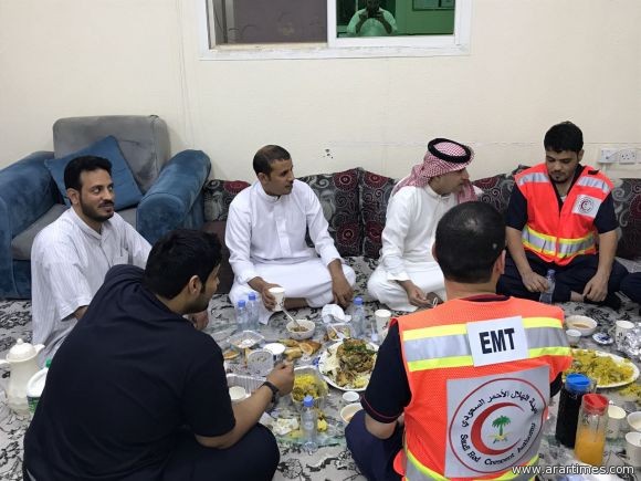قام مدير عام فرع هيئة الهلال الأحمر السعودي بمنطقة الحدود الشمالية محمد بن نايف العنزي ويرافقه مساعده للشؤون الإسعافية والمتحدث الرسمي للفرع مساعد بن غالي العنزي بتناول وجبة الأفطار مساء هذا اليوم الجمعة مع زملائهم العاملين في غرفة العمليات والقيادة الميدانية في اجواء يسودها التسامح والإخاء ، ويأتي ذلك بعيداً عن التعاملات الرسمية بهدف تعزيز الانسجام ، وتعمّق اواصر الزمالة لتتحول الى صداقة دائمة تبنى على الود والأحترام المتبادل .