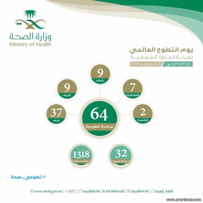 صحة الشمالية تطلق 64 مبادرة صحة تطوعيه في اليوم العالمي للتطوع والذي يصادف 17/3/1439هـ 5 ديسمبر 2017م تحت شعار تطوعي صحة حيث سجلت صحة الشمالية 64 مبادرة تطوعية موزعة على 32منشاه صحية وكانت المبادرات موزعة على المدن في الحدود الشمالية وقد حصلت مدنية عرعر على 37مبادرة كأعلى مدينة في تسجيل المبادرات ثم طريف و رفحاء كلاً منهم 9 مبادرات والعويقيلة 7 مبادرات وشعبة نصاب مبادرتين . حيث سجلت الصحة 1318 متطوع في صحة الشمالية تهدف هذه المبادرات الى زرع ثقافة التطوع في الممارسين الصحيين ونشر المبادرة وزرع روح التعاون .