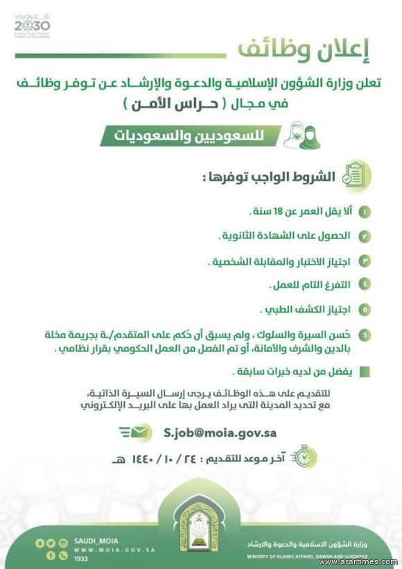 تعلن وزارة الشؤون الإسلامية عن توفر وظائف في مجال (الدعوة، مراقبي المساجد، حراس الأمن)، وللتقديم على هذه الوظائف يرجى إرسال السيرة الذاتية مع تحديد المدينة المراد العمل بها على البريد الإلكتروني