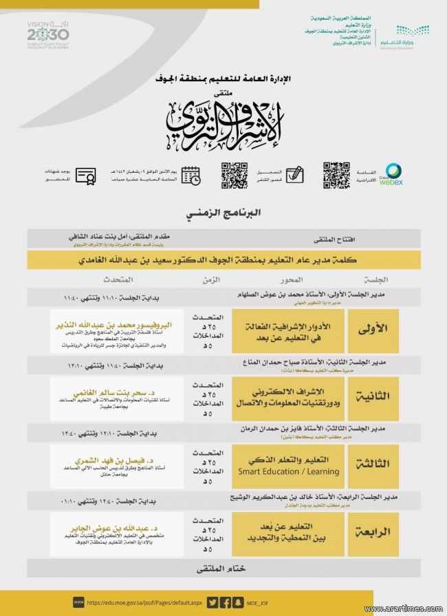 نظمت الإدارة العامة للتعليم بمنطقة الجوف ممثلة في إدارتي الإشراف التربوي "بنين-بنات"، ملتقى افتراضي عبر الاتصال المرئي والذي حضره عدد كبير من مشرفي ومشرفة على مستوى المملكة.