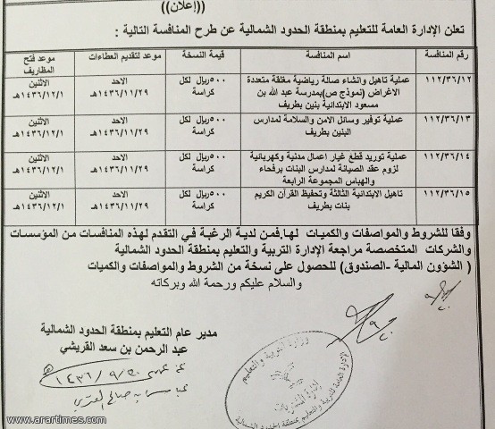 أعلنت الإدارة العامة للتعليم بمنطقة الحدود الشمالية عن طرح ١٥ منافسة عامة للشركات والمؤسسات الوطنية للتقدم لشراء الكراسات من إدارة المشتريات في مقر الإدارة بمدينة عرعر .